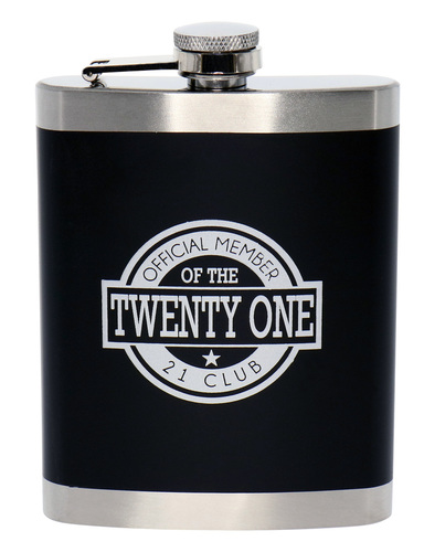 Our 7oz Stainless Steel Hip Flask features a badge saying "Official Member of the Twenty One 21 Club".