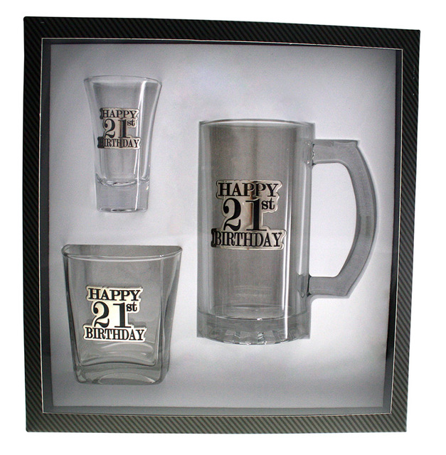 Boxed giftset for that special person turning 21. Each vessel is made from sturdy glass and has a silver coloured plaque with "HAPPY 21st BIRTHDAY" printed in black.