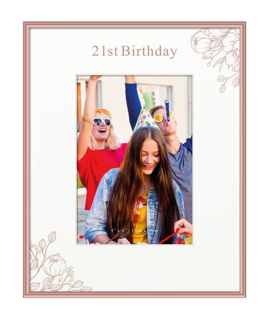 Beautiful box-style photo frame. A rose gold metal frame with a space for a 10cmx15xm (4"x6") photo. Above the spot for a photo are the words, "21st Birthday" and the corners are decorated with line drawings of flowers.