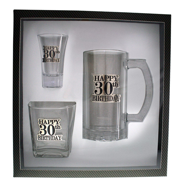 When one glass simply is not enough, this smart-looking set of glasses comes to the rescue offering a beer handle, a shot glass and a whisky tumbler. Each glass has a silver-coloured emblem on the front reading, "Happy 30th Birthday"