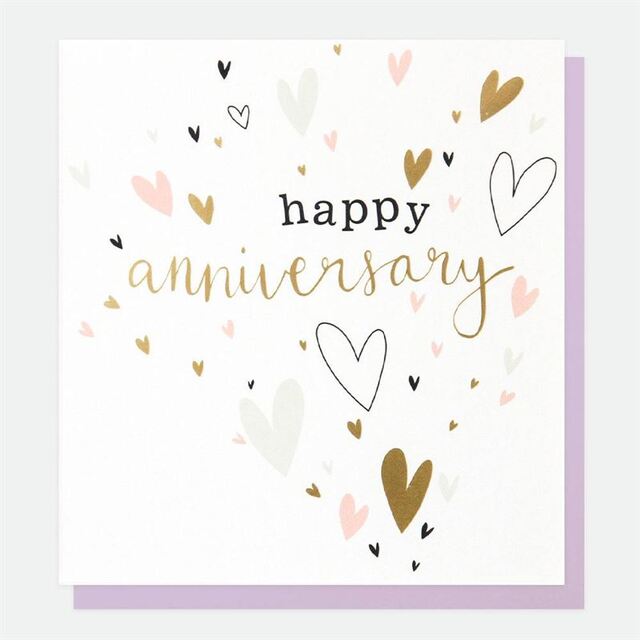 Our cards feature scatterings of pink and gold hears with the words Happy Anniversary. This card has been printed on board using a low chlorine pulp from sustainable forests and can be recycled.