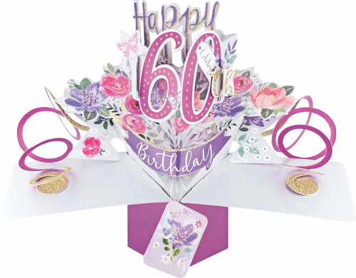 Reads "Happy 60th Birthday", is decorated with flowers, ribbons and a butterfly. There are two places to write your message.