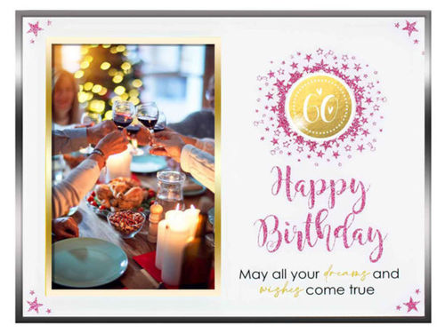 There is space on the left for a 4"x6" photo. On the right is a "60" and the words, "Happy Birthday. May all your dreams and wishes come true" written in sparkly pink, gold and balck.