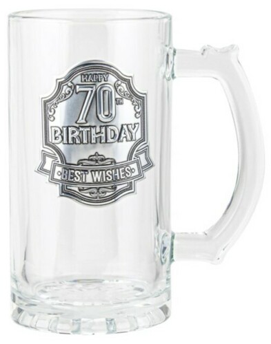 Made from high quality, heavy glass, with a silver look badge with "HAPPY 70TH BIRTHDAY - BEST WISHES"
