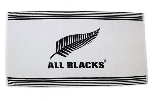 White with a large black silver fern and ALL BLACKS written beneath it. Stripes at the top and the bottom frame this fabulous towel.