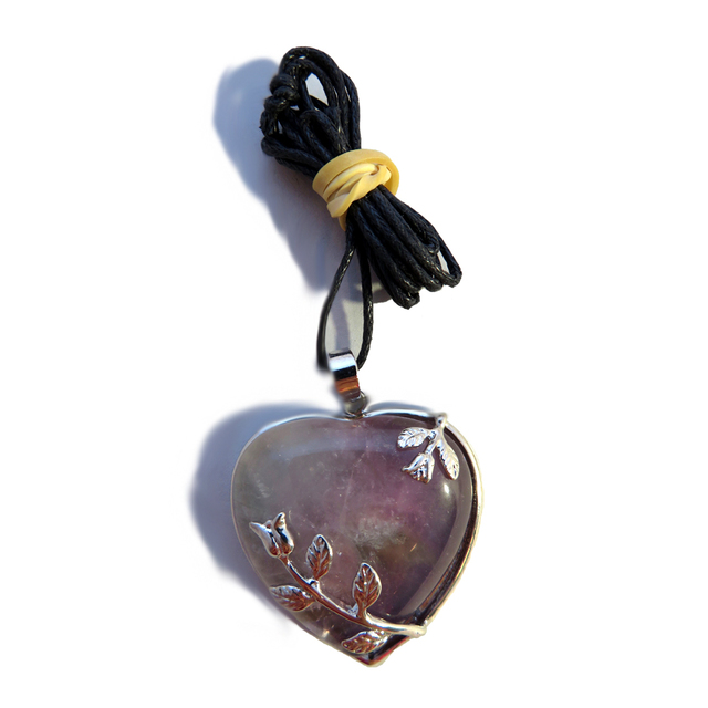 Our beautiful amethyst heart pendant is set in silver-coloured metal with a couple of small roses adorning it. An adjustable black cord is attached.