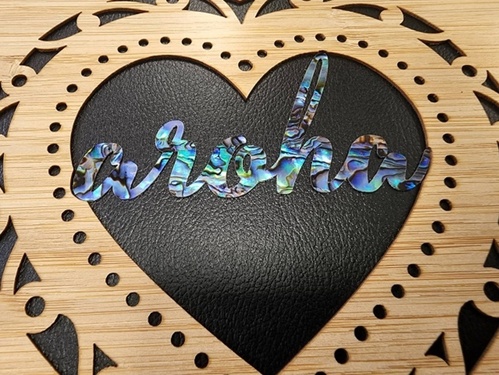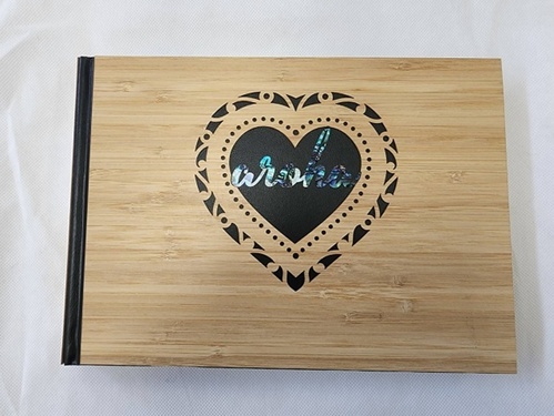 Our bamboo album with cut-out heart and 'aroha' written in natural New Zealand Paua shell.