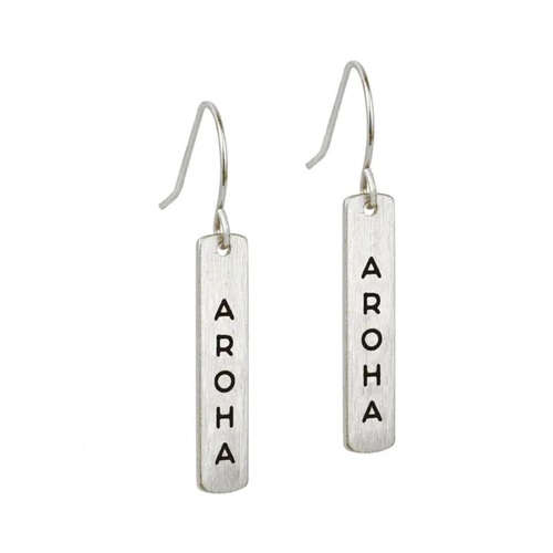 Lovingly handmade using fine brass, layered in 925 silver, these rectangular drop earrings have "AROHA" engraved into them.