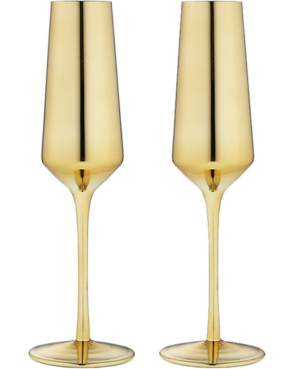 Entertain in style with this luxurious set of two Champagne flutes. Make every toast a special toast. Glasses are coated in a metallic gold finish.