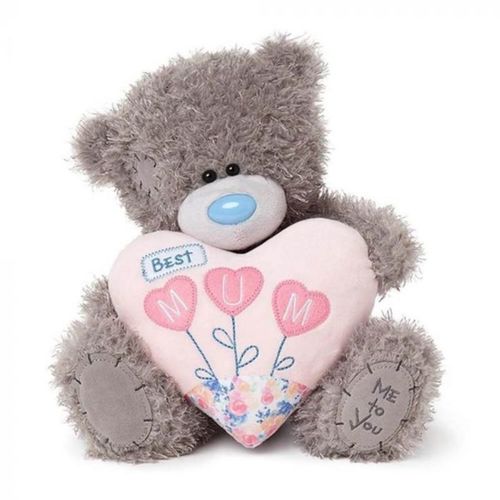Celebrate your Mum with this gorgeous teddy bear. Tatty Teddy shows off its soft grey fur and shiny blue nose. In Teddy's hands is a pale pink cushion with "BEST MUM" embroidered on it.