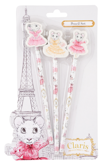 Claris fans can sketch their very own couture looks with this lovely pencil set. Featuring a beautiful wrap around Claris pattern on the outside of each pencil, the set includes 3 grey-lead pencils, complete with a different Claris shaped eraser topper, each with their own chic look.