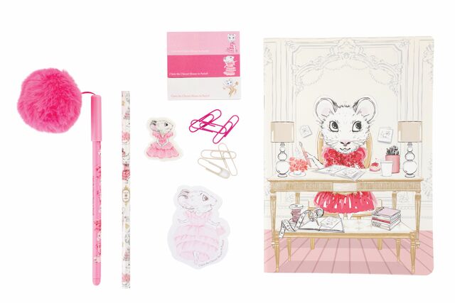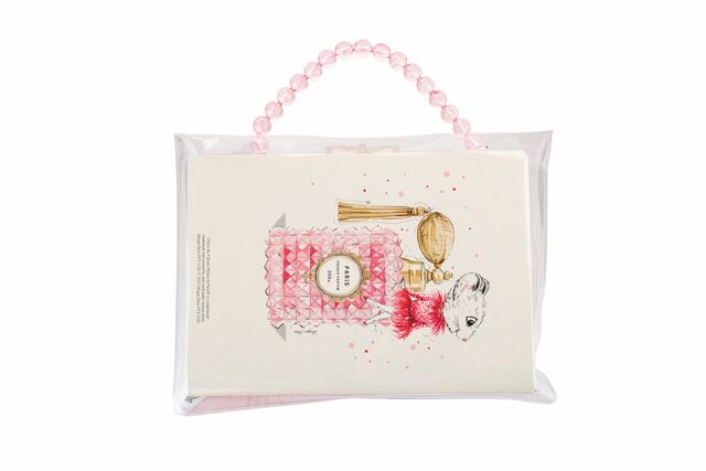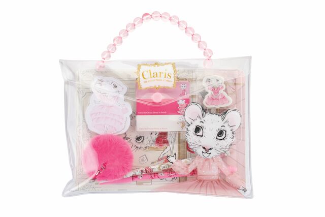Our stylish Claris Stationery Set is packaged in a clear plastic wallet with a pink bead handle. The set includes a pom pom pen, a note book, pencil, sticky note pads, paperclips and an eraser.