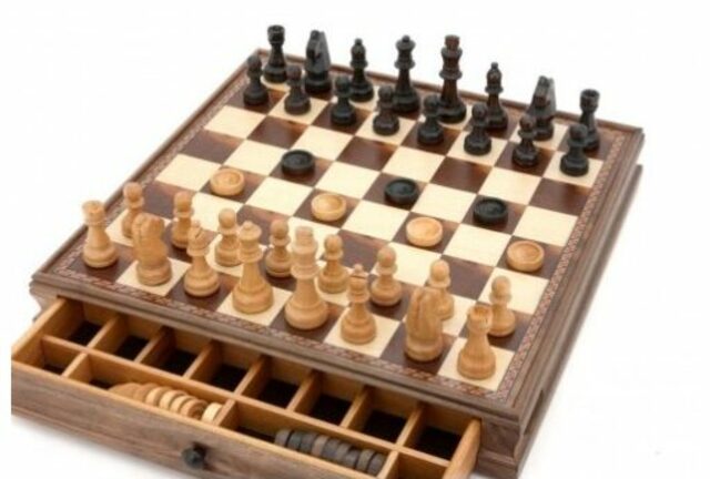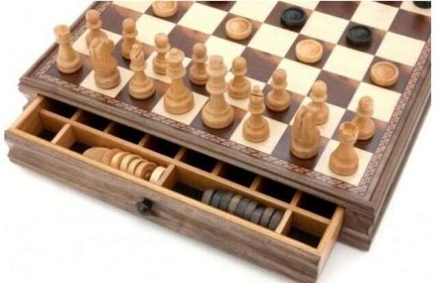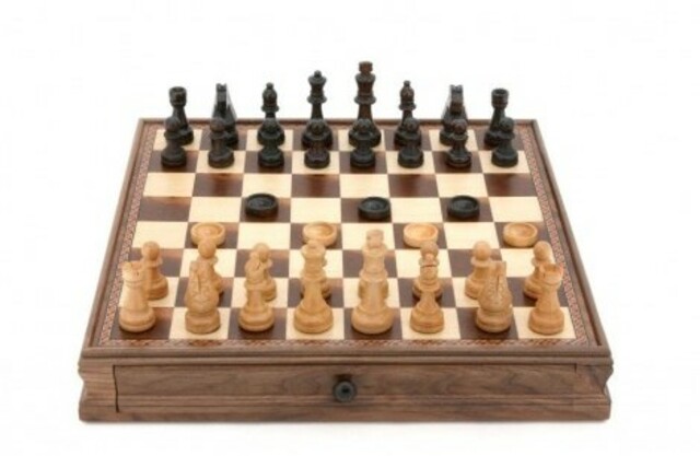This is a very handsome board with a very convenient draw, complete with compartments for the chess and checkers pieces. The chess pieces and the board have felt on their underside.