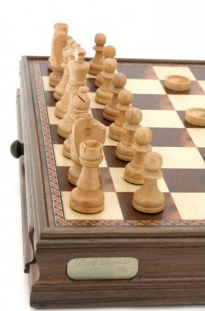 Dal Rossi Walnut Chess & Checkers 38cm set with drawers and compartments for chess pieces.