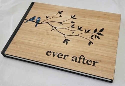 Beautiful wooden album/journal with cut out branch and two natural New Zealand paua birds. The words 'ever after' are featured at the bottom of the cover.