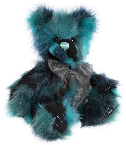The paw-some Filigree is a fully cuddle trained, Random Plush bear in shades of blues and black. Every bear's markings are unique - the photo is just a representation of the markings you might receive. She has a turquoise hand-embroidered nose, a lightly trimmed muzzle, dark expressive eyes, black paw pads with turquoise toe detailing and is complete with a pretty bow.