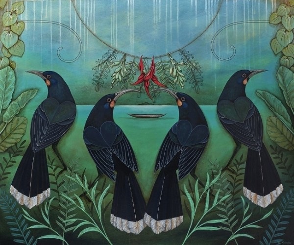 A beautiful print in bright, vibrant greens and featuring 4 beautiful Huia birds.