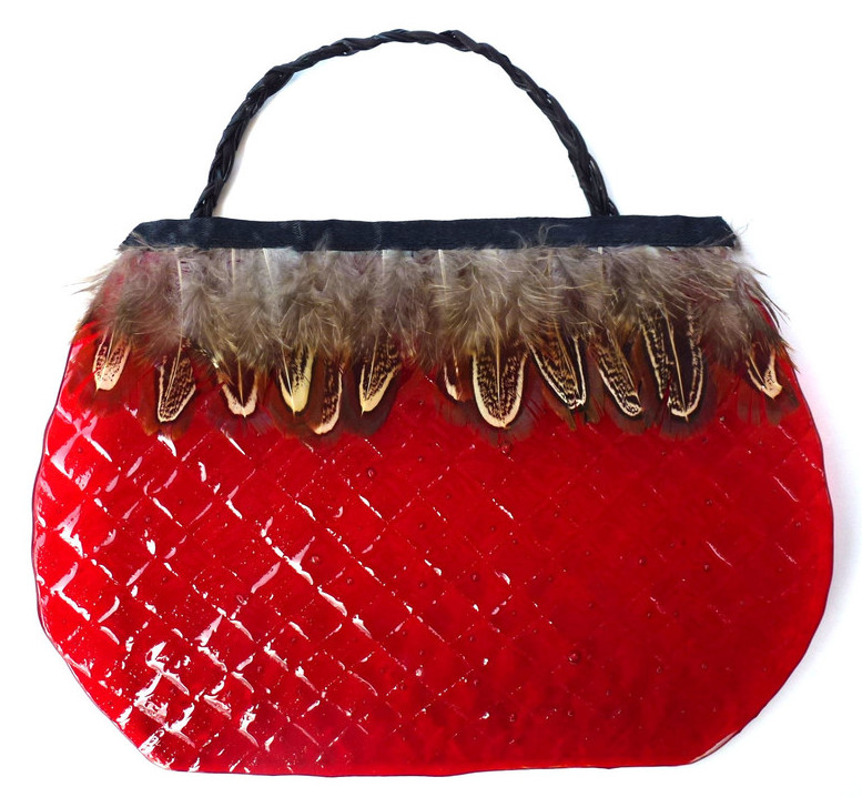 Soft quail feathers are used for the trim and the flax plaited handle has been dyed black.