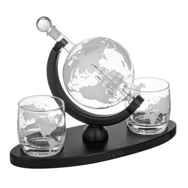 - Globe decanter, set on an adjustable mount and with an old-style sailing ship inside it.