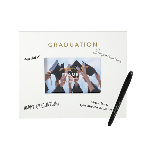 Graduations are such a special time. So much hard work to get to this point. Celebrate the accomplishment with this white graduation photo frame. It comes with a black marker pen so everyone can sign it and give their best wishes for the future. The word "GRADUATION" is written in gold above the photo.