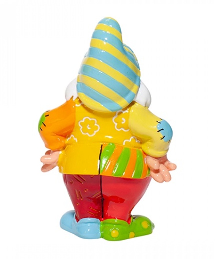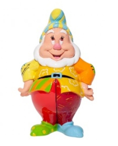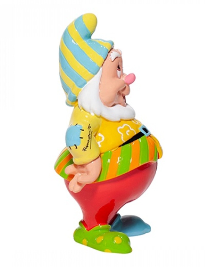 He's the dwarf everyone wants to hang out with. Happy is bright and cheerful and has an infectious personality that spreads joy and happiness to others around him. With a cheerful pop-art makeover Happy looks very pleased with his yellow top covered in a fun flower pattern, his bright pants, and his funky striped hat.