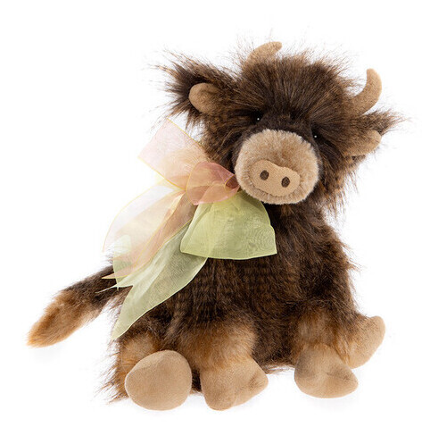 Hilltop is an udderly adorable cow with dark expressive eyes. He is made from feathery brown plush fabric and features beige horns, inner ears, nose and hooves.