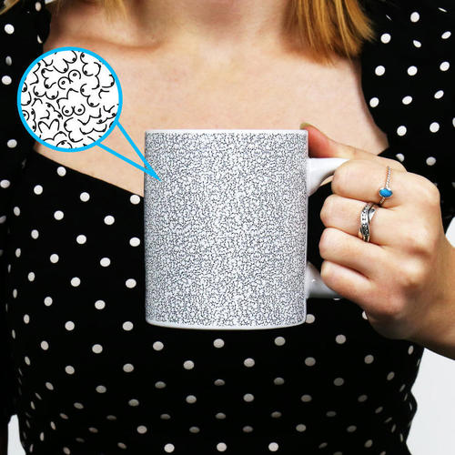 From far away the microscopic pattern looks like an unassuming, tit free mug, but when they go to take a sip they’ll realise this mug bears billions of itty bitty boobs.
