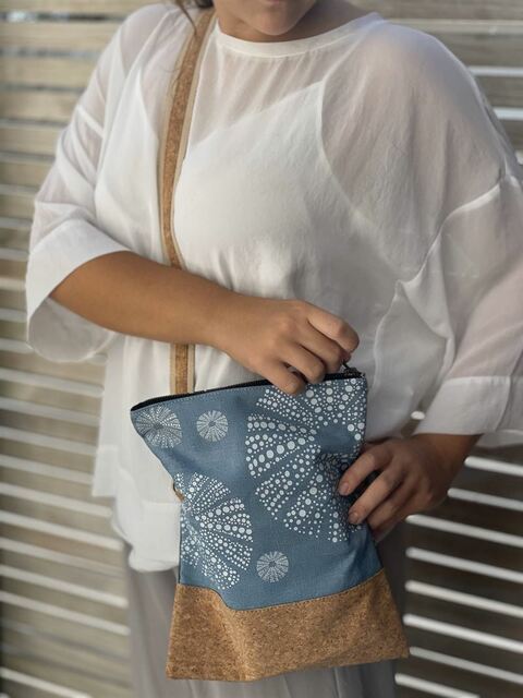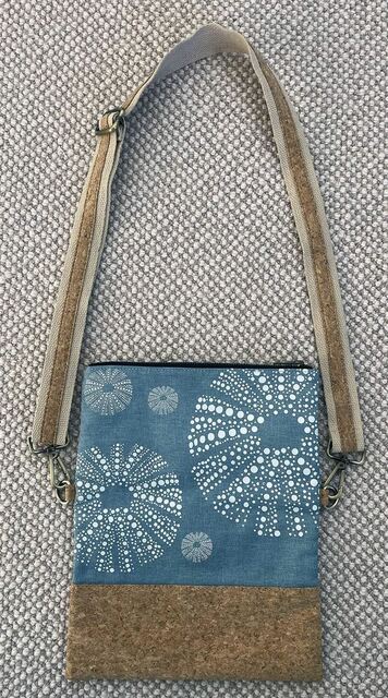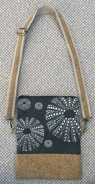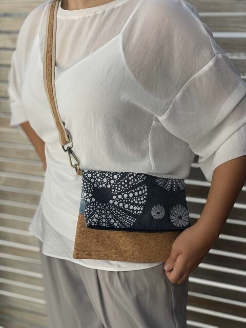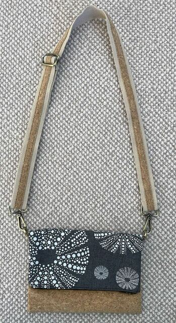 Fold-over bags with adjustable strap featuring stylised New Zealand designs by Jo Luping. The bag can be worn extended or folded over depending on how much you want to carry. This makes it a highly versatile bag for all your daily needs. The adjustable shoulder strap is a durable cotton canvas, 30mm wide x 1 metre long at full length, with cork stitched on top. The strap is removable and fastens to each side of the bag with quality heavy duty brass coloured hardware.