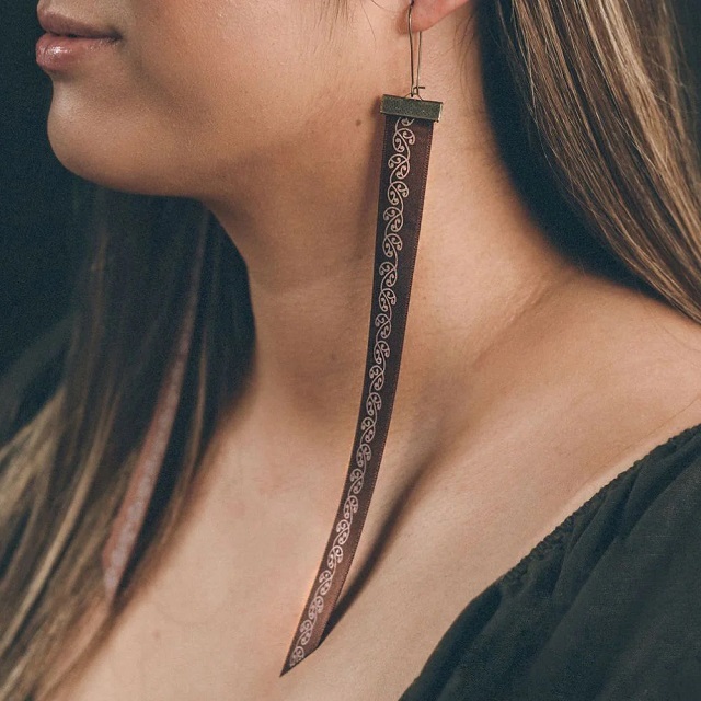 The Kia Māia earrings feature a mangopare pattern flowing down forest green coloured satin. The pattern is an ode to strength and tenacity. The long satin ribbons pay homage to historical images of tāne and wāhine adorning their ears in similar ways.