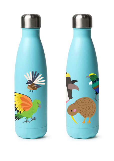 Moana Rd drink bottle featuring all our favourite New Zealand birds.