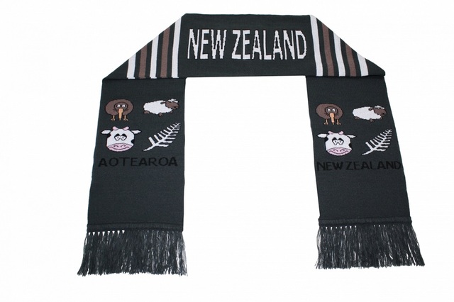 Fun, New Zealand made Kiwiana scarf with "NEW ZEALAND" written on one side and "AOTEAROA"