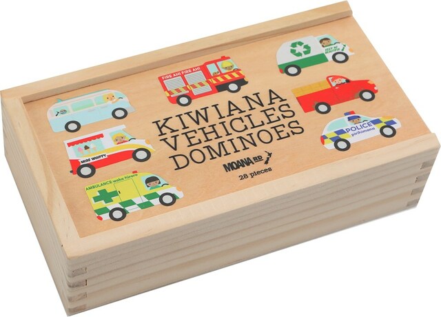 28 dominoes beautifully presented in a wooden box with a sliding lid. The dominoes pieces have classic New Zealand vehicles on them - there's a ute, an ice cream truck, the kombi van, police car, recycling truck, fire engine and ambulance.