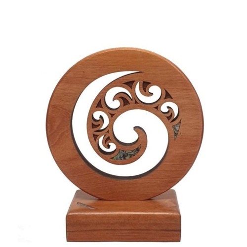 The Koru within the circle is engraved with 5 smaller Koru with a couple of splashes of natural New Zealand paua for colour. Made from Pacific Rimu, the koru sits on a base which also has a touch of paua on it. The base can be removed for easy engraving.