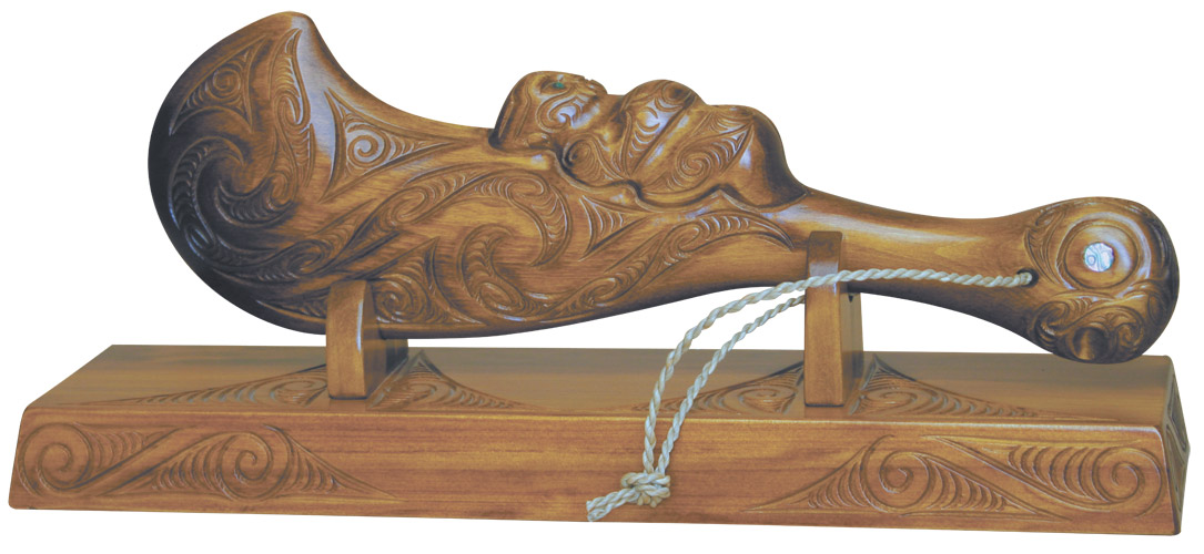 Our Large Wahaika is made from sustainable tulipwood and hand carved here in New Zealand by local carvers using traditional techniques. It sits on a matching base.