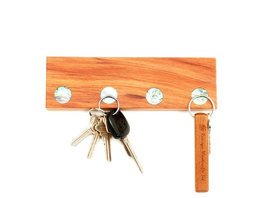 Rimu key holder with a contemporary New Zealand flair. This elegantly simple key holder is made from beautiful New Zealand Rimu wood and New Zealand paua shell. Behind the paua shell are strong magnets - allowing your keyring to magnetically attach to the holder. It has an adhesive strip on the back to stick to a wall.
