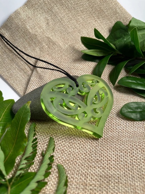 Treat someone you love with this beautiful manawa pendant. Stylish laser cut koru fill this heart pendant. The light green acrylic gives a pop of colour to an outfit. I think if I owned this one (nudge, nudge) I'd hang in in my window when I wasn't wearing it.