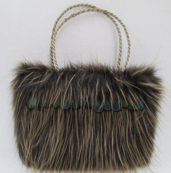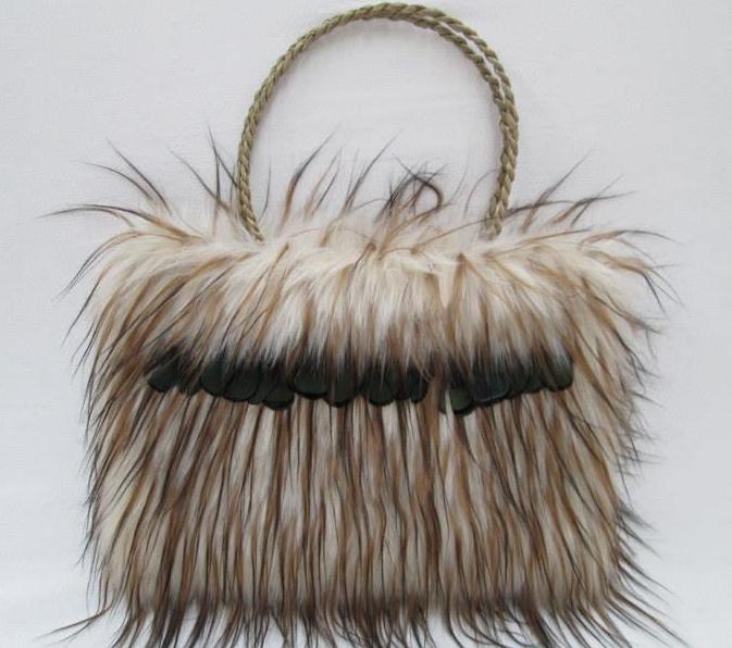 Our funky small bag is made from a faux fur (man-made) fabric that matches our Korowai. It has a seagrass twisted handle.