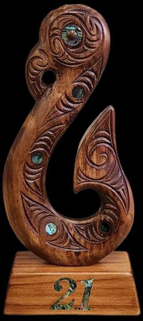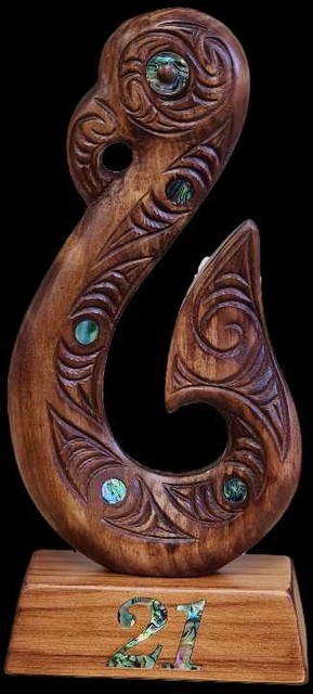 A wonderful, meaningful alternative to a 21st key. This hand-carved Matau sits on a wooden base with a paua "21" inlaid into it.