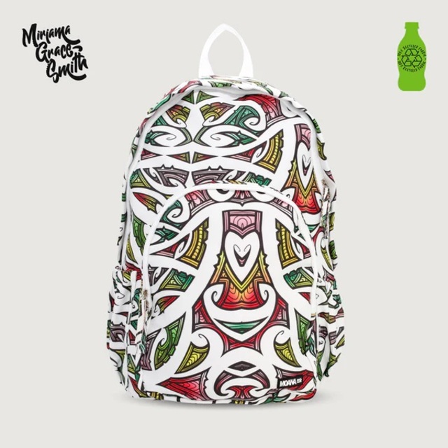 Miriama Grace Smith and Moana Rd have come together again and produced this fabulous backpack. Featuring adjustable padded straps, two side pockets, a generous, zippered front pocket (with a pen organiser inside) and a full-size padded laptop pocket inside.