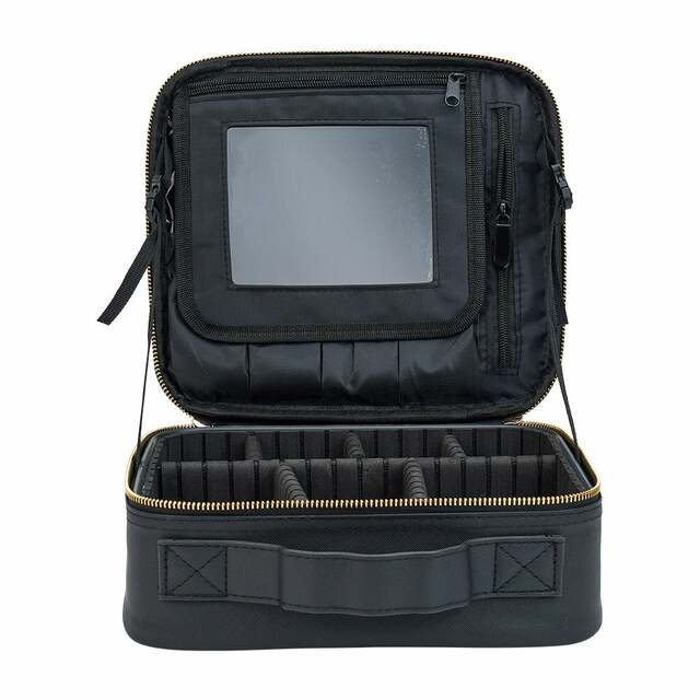 Our dedicated make up case that has interchangeable compartments so you can fit all your sized items in the designated areas of the case. There is a mirror that can be balanced onto the edge of the bag for easy use, as well as a special brush compartment for storing delicate makeup brushes so they don’t get damaged. The bag also works well as a jewellery bag or for storing cords and chargers when travelling. This bag is a winner!