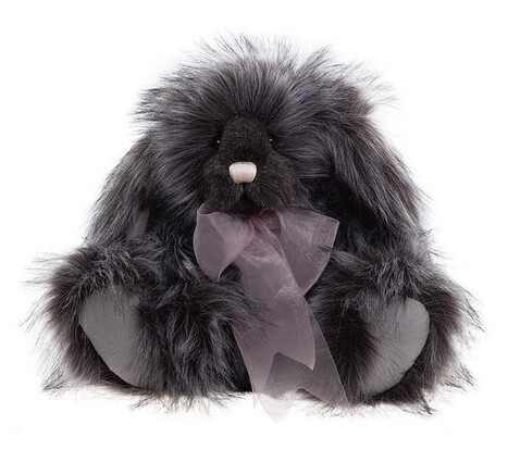 Moonbeams is ready to hop right into your heart. Moonbeams is crafted from soft, dense, long dark grey plush with white tipping, giving her a unique and endearing appearance. She has a hand-embroidered pale pink nose and wears an organza bow around her neck to match. She has the sweetest, long and soft lop ears and gives the best cuddles.