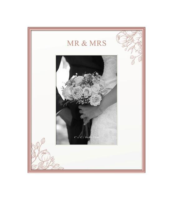 Beautiful box-style photo frame. A rose gold metal frame with a space for a 10cmx15xm (4"x6") photo. Above the spot for a photo are the words, "MR & MRS" and the corners are decorated with line drawings of flowers.