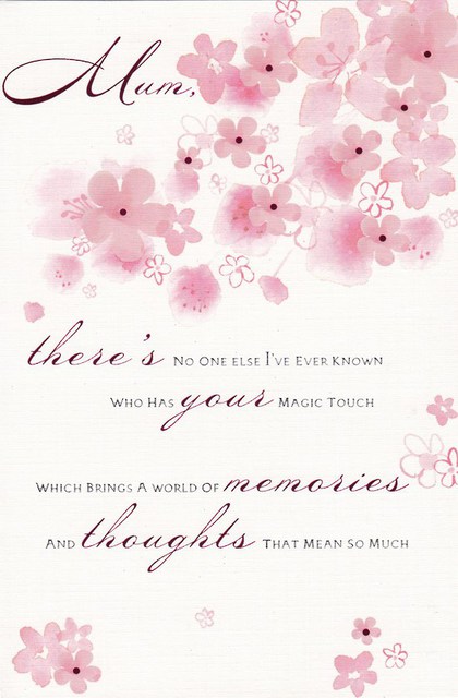 This front of this card reads "Mum, there's no one else I've ever known who has your magic touch which brings a world of memories and thoughts that mean so much."