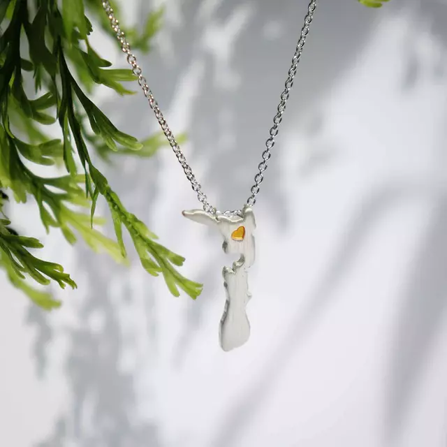 A sterling silver outline of Aotearoa, complete with little gold heart engraved into it, hangs on the end of a silver chain. Presented in a very cool glass bottle with a cork lid.
