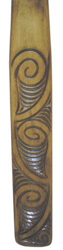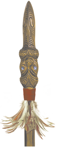 Our longest taiaha, boasting an impressive length of 152cm! With an intricately hand-carved broad head and a trim of feathers. Please note that the colour of the binding and the feathers will vary from piece-to-piece. This taiaha has a long, thick shaft and more carving adorns the bottom/blade.