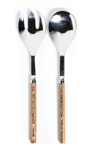 Made in New Zealand with stainless steel servers, rimu handles and paua inlay.
