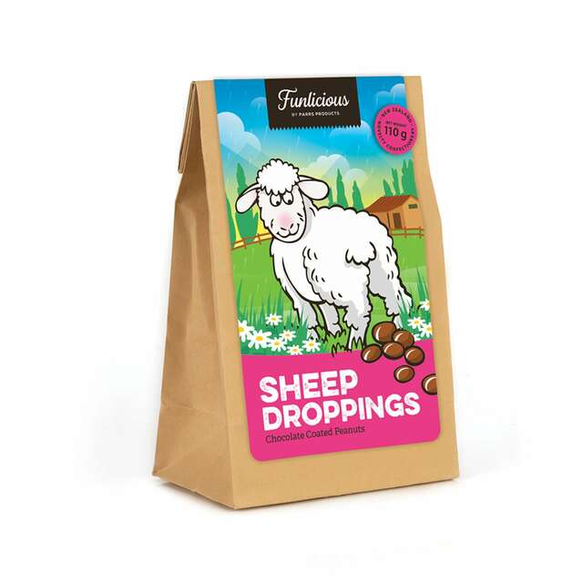 Chocolate Coated Peanuts. New Zealand sheep poo is often used for fertilising the garden, and although these Chocolate Sheep Droppings are the same consistency and colour as sheep poo, we can assure you they will not improve plants. They will be much better placed in your mouth so you can enjoy their delicious crunch and sweetness.