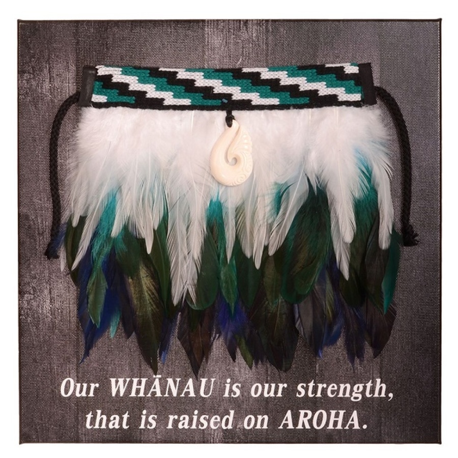 The words say "Our Whanau is our strength, that is raised on Aroha"