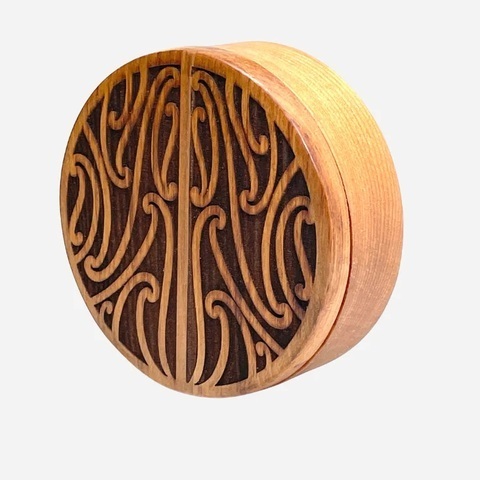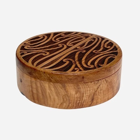 This recycled native NZ Rimu timber box features an engraved design inspired by the traditional puhoro pattern that adorns waka (canoes) and is seen in Ta Moko. By blending contemporary form with classic Maori artistry and flair, it resonates with both the present and the past, exuding authenticity and deep cultural significance.