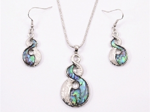 Kiwiana twist necklace set. Laser pattern on Rhodium with NZ paua shell.